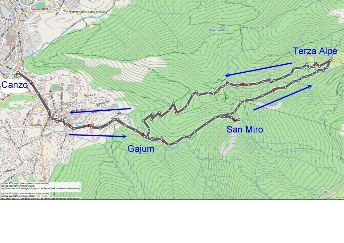 Contrariamente a quanto inserito sulla locandina, la partenza e l'arrivo sono avvenuti da Canzo. Dal centro di Canzo si è raggiunta la località Fonte Gayum a 490 m. Da qui si è iniziata la percorrenza del Sentiero Geologico Giorgio Achermann seguendo il percorso del torrente Ravella che si attraverserà diverse volte ; infatti sono ben otto i ponti e ponticelli che lo superano, più due passerelle su un suo affluente. I punti più interessanti del percorso sono evidenziati da una ottima cartellonistica che chiarisce le emergenze geologiche del luogo. A metà del percorso è stata effettuata una breve deviazione per visitare la Chiesetta di San Miro. Il percorso prosegue quindi su una comoda mulattiera che si inerpica in mezzo ad un bosco misto, fino ad arrivare ad una serie di gradini che permettono di affrontare più agevolmente un tratto con dislivello maggiore, ed arrivare poi al Rifugio di Terz'Alpe, dove si è sostato. Alcuni hanno optato per il pranzo al sacco altri hanno preferito pranzare presso l’agriturismo “La fattoriaâ€. Per il ritorno si è seguito un comodo sterrato che attraversa l'antico abitato di Second'Alpe e raggiunge la località di Prim'Alpe - alternativo a questo percorso e molto interessante è il "Sentiero dello Spirito del Bosco" fiancheggiato da interessanti sculture lignee. Dopo una sosta ristoratrice alla fontana del Prim'Alpe e la visita alla stuttura - all’interno si trova e si puoÌ€ visitare un piccolo museo con reperti, pannelli interattivi e informazioni sulle peculiaritaÌ€ naturalistiche e geologiche della zona - si è rientrati a Canzo transitando nuovamente per Gajum, e quindi alla stazione ferroviaria.